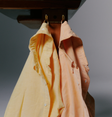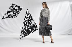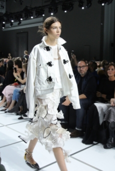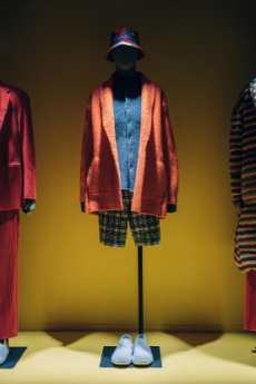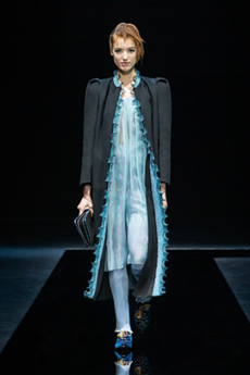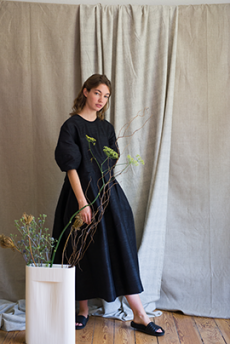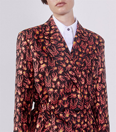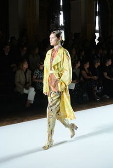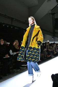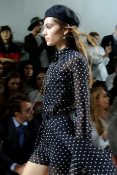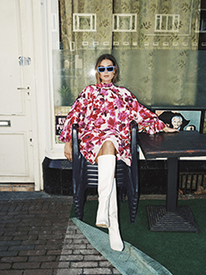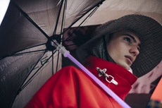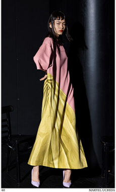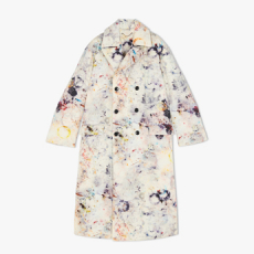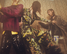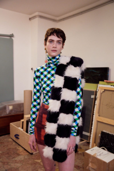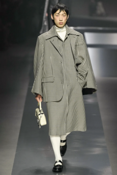 Soft oversized mohair knits with polka dots, gently alluding to a sense of naiveté. Floral prints combined on a big selection of fabrics, from cotton to silk plissé. Long coats, in beautiful classic textiles, pin striped or checked, evolving into tunic-like dresses turned back-to front.