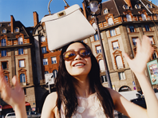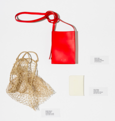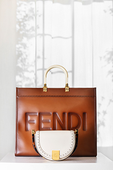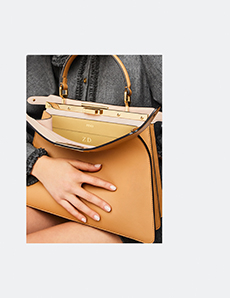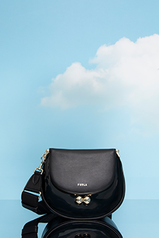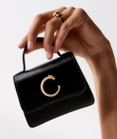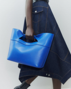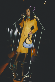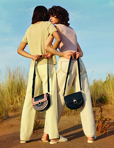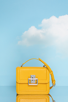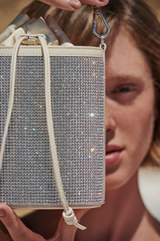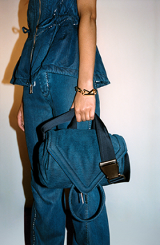 Materials converse: panama organza and silk cloqué billow like light through a lattice, while cotton stretch denim and raw canvas answer with a measured, utilitarian cadence. Leather and nappa add a tautness, a memory of touch. The Alice bag appears as an emblematic shard of sun — a handheld geometry in horsehair and mirrored leather — a bright counterpoint to disciplined tailoring.