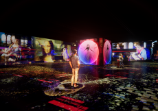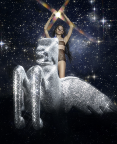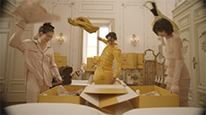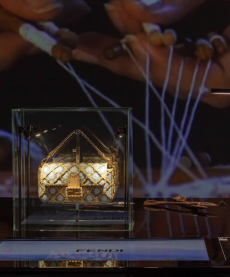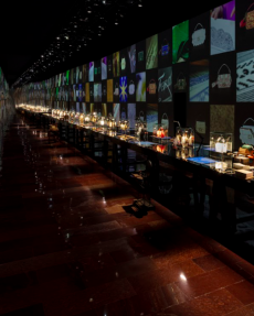 The journey continues as Hermès’ emblematic horse, rendered in motion, gallops across a festive dimension. A dazzling structure shifts and transforms, a windmill at its center, while the woody notes of Barénia Eau de parfum diffuse through the space. Twillies whirl and clusters of jewelry sparkle, weaving together a narrative of joy, rhythm, and discovery.