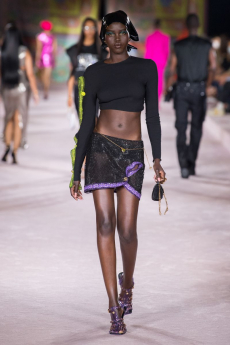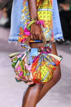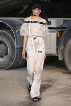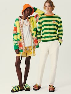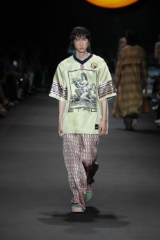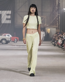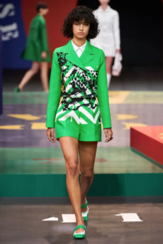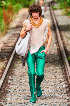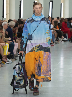 Silhouettes are completed with accessories like visored bucket hats, pop military backpacks and high-top sock sneakers in a color palette that is everything but boring.