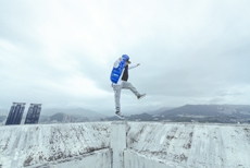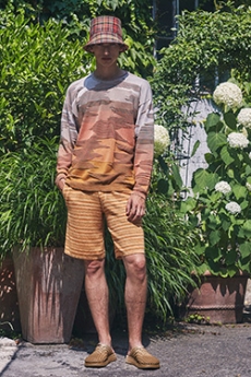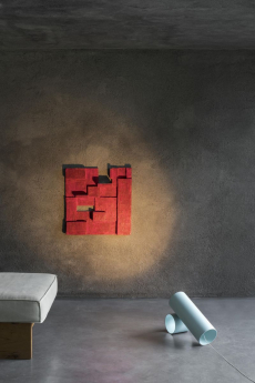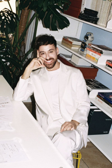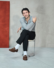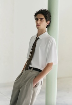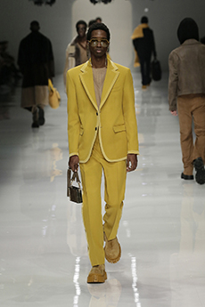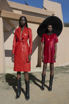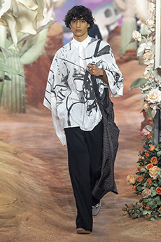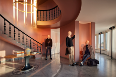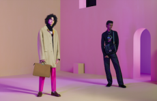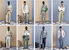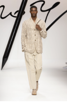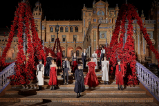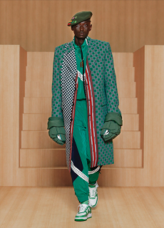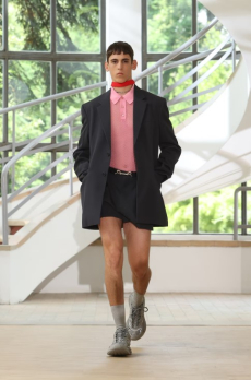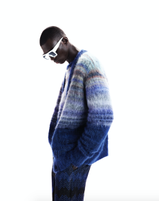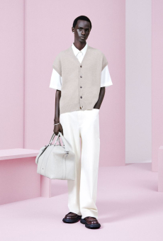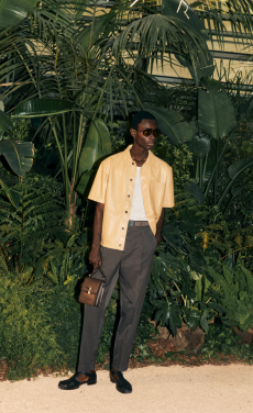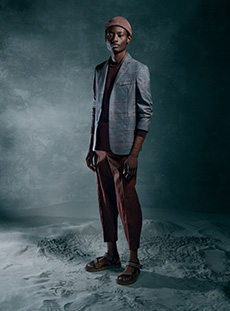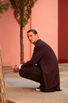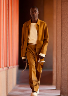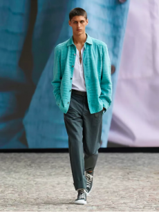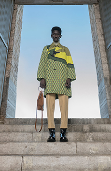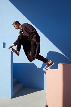 Color, light and the graphic lines of both the location and the clothes play a key role in expressing the essence of the collection and its distinctive mismatch of 3D textures, volumes and shiny/matte effects, all awash in terracotta red, turquoise, plum, sky blue and burnt orange. The striking architecture of the Muralla Roja building, characterized by interlocking strairs, platforms and bridges, exalts a lifestyle appeal that Goode elevates with his effortless and dynamic sprit, melding time-honored savoir-faire with a fashion-forward twist.
