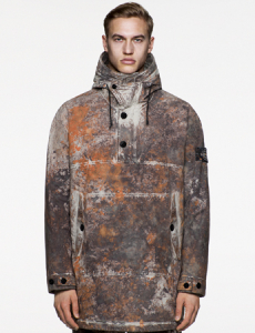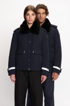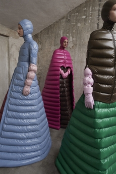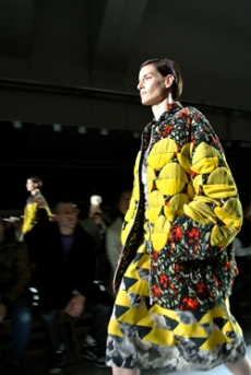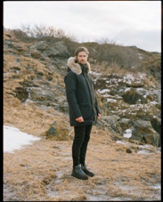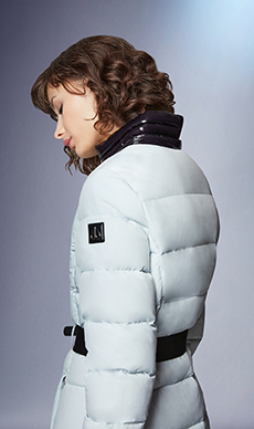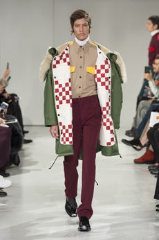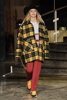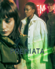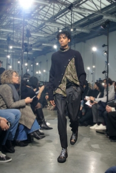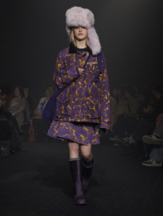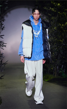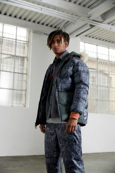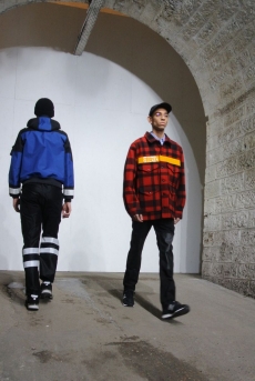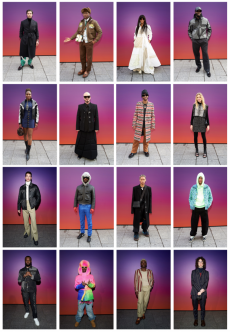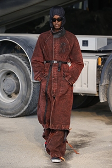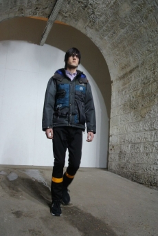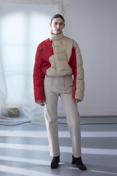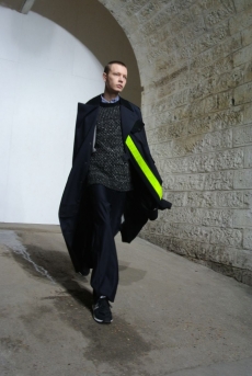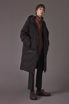 Inspired by 'Independent People' by Nobel Prize winning author Halldor Laxness, the collection plays with the colors of Icelandic landscapes ranging from chalk grey to yellow. Shades of ice, brown and lava are chosen to give life to coats, parkas, heavy felts and comfortable shapes designed to face the harsh temperatures of Nordic winter in style. Military cotton and heat-sealed waterproof wool make coats and blousons, put together by big Velcro stripes.The collection's prints are a new take on glitch art that plays with disintegrated images.