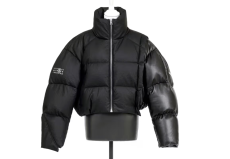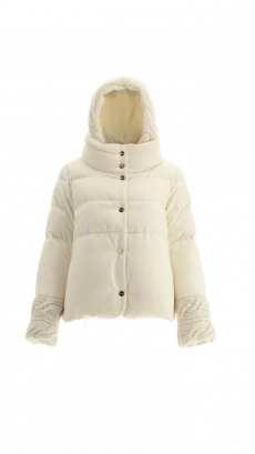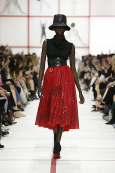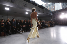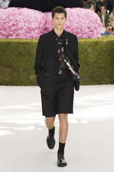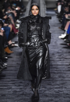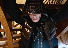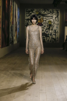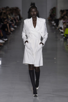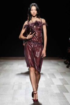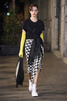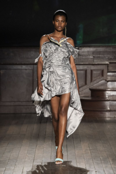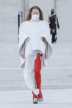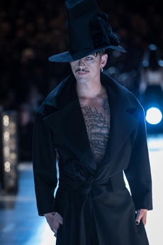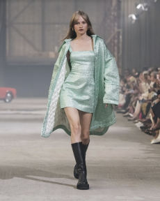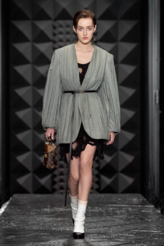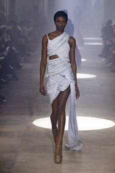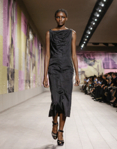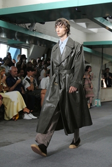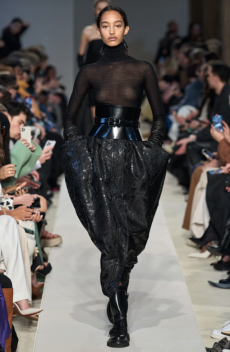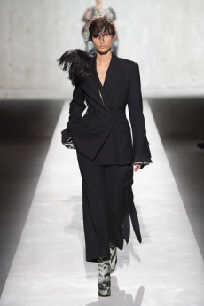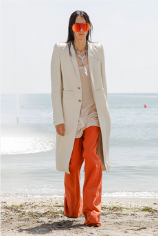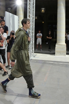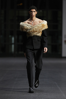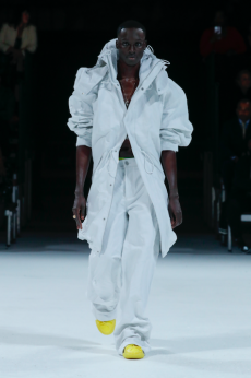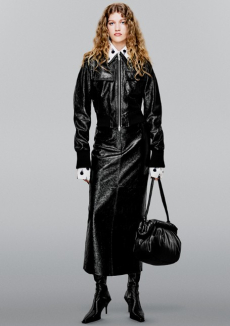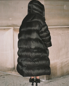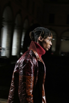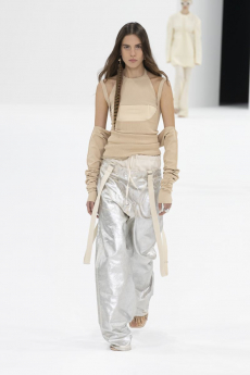 Deconstructed silhouettes of puffa jackets, blasers together with leather dresses pulled down and worn as captured in the second of taking them off. There was a strong sense of moving on, of change and positive transformation for a designer who has been building his reign on shades of darkness. Rick Owens chose a colour palette recalling his early work: olive green, khaki, black, shades of brown. It was as if the designer was looking for the initiation moment. The rebirth, the celebration of a future soon to come.