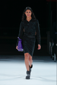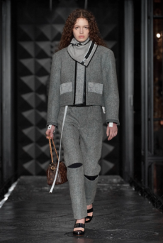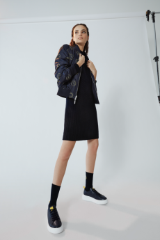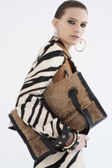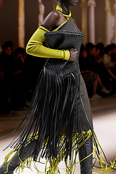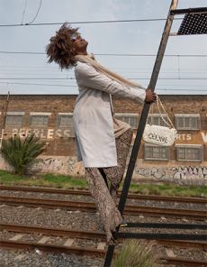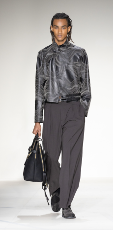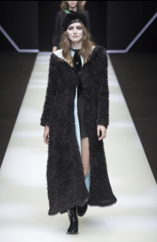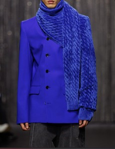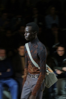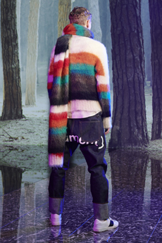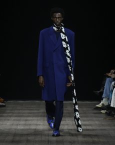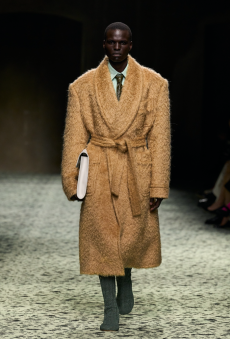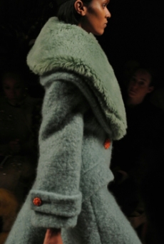 The Womenswear collection followed up in a more gentle and feminine declination. We saw easy urban long cable knit dresses, A –line coats, teddy handbags and delicate dresses with transversal side cuts, revealing floating strings, as a sort of intellectual reference to the increasingly undergoing destruction of our Mother Earth.