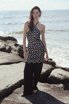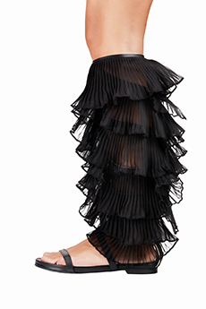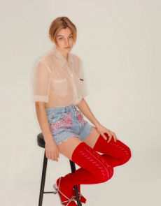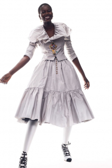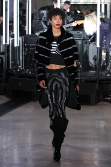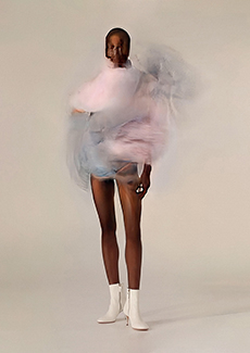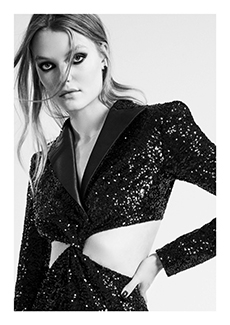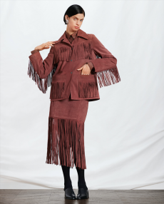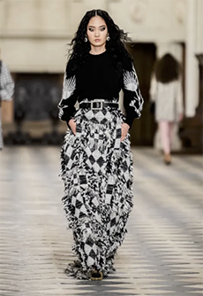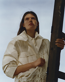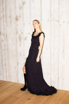 Frayed edges and star lace trimmings give a certain sense of poetic punk bohemia to dresses, skirts and shirting. Knits, iconic elements of Lala’s wardrobe that incorporate jacquards with frayed details are a sumptuous tapestry of textures.