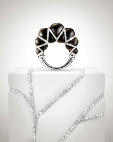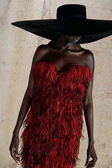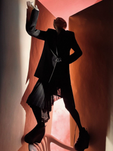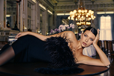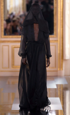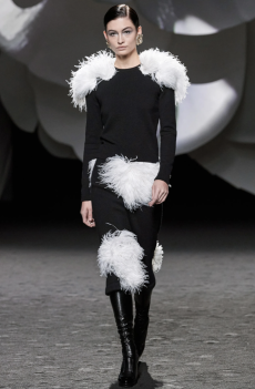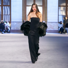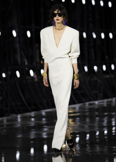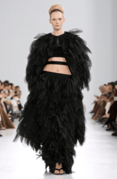 Gestures of sprezzatura define the silhouettes: slingback kitten heels casually stepped into, supple mules collapsing with intent, tailoring softened into languid nonchalance. Extremes coexist in contrapuntal harmony: feathered opera coats and high jewelry on one hand, the minimal eroticism of sheer hosiery garments on the other.