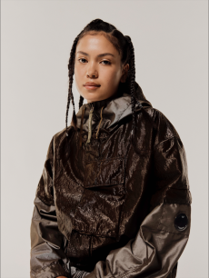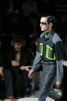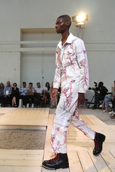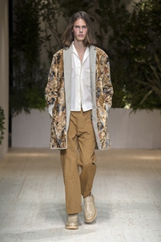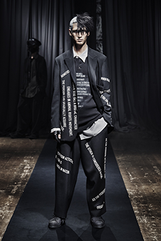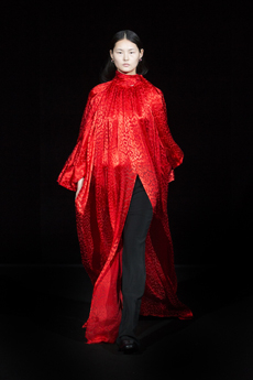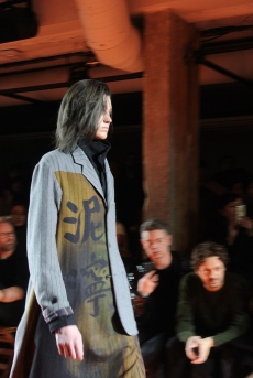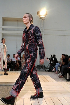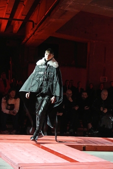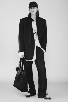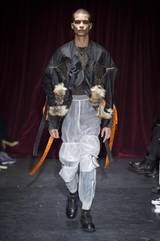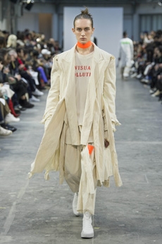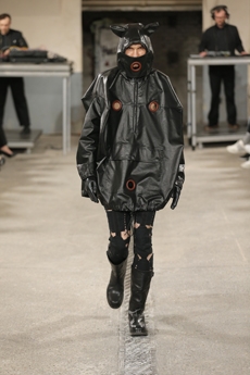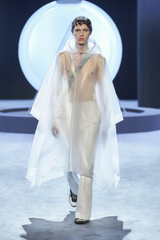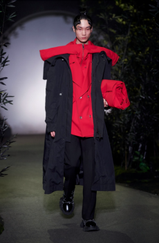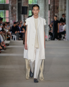 Designer Shangguan Zhe's latest collection holds man's relationship with space and chemistry at its core, proposing garments that overlap with the idea of consuetude. Military uniforms with raw edges, primitive top-stitched suits and parkas, jumpsuits with industrial strap and bio-chemical protections, just a few examples of Zhe's research-based project. Zhe, indeed, created his own textiles mixing industrial materials and aramid fibers, usually used for spacesuits to give birth to his undoubtedly contemporary and updated vision.