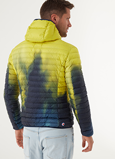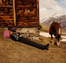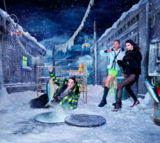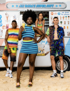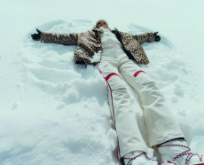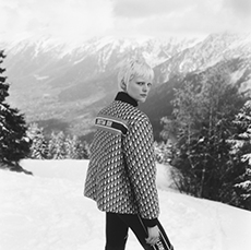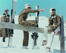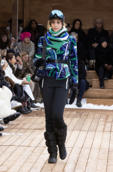 The dip-dyed long knits in rainbow colours with matching ski masks worn under solid coloured puffa jackets and graphic digitally printed technical ski suits.