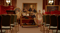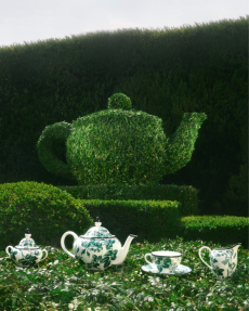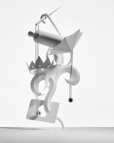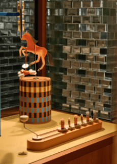 Langkamp’s kinetic design captures the poetry of a gentle wind. A system of pulleys and hand-activated mechanisms animates three distinct sceneries, resembling that of old puppet shows or the Crowleys of the old, inviting visitors into a world where objects and imagination intertwine. In the first tableau, a constellation of silk gavroches rotates freely, suspended in air like notes of music caught mid-flight. Nearby, a whimsical tea party — cups, saucers, and the sculptural Saut Hermès teapot — spins playfully, brought to life by visitors through hand-cranked handles ingeniously built into the installation.