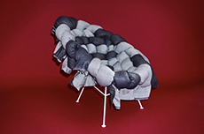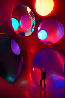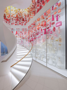 Fluffy fur - fake fur - in a deep shade of lilac, literally covering the sits, walls, columns and the grand stairways of the spectacular concrete architecture of Palais d’Ièna designed by pioneer Auguste Perret for the Exposition Universelle held in 1937.