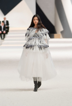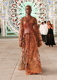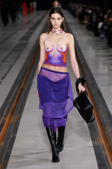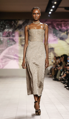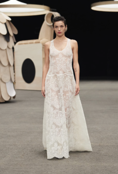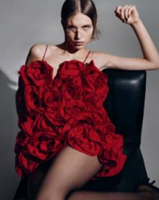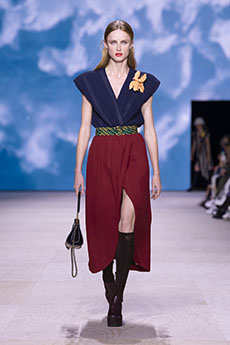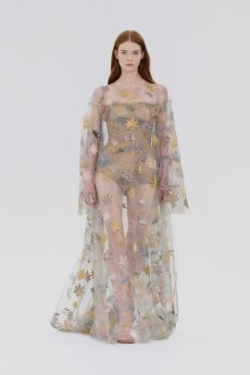 In times of instability, Sportmax looks outward - and upward. The collection is a study in contrasts: dreamy yet grounded, architectural yet fluid, sensuous yet serene. Organza takes on unexpected roles - lining tailoring, shaping trench coats, and floating over trousers with ghost-like grace. Meanwhile, doublé wool and glove-soft leather anchor the dream in urban functionality. Floral motifs take center stage, but not as you'd expect. Botanical patterns - painted using Japanese cosmetics - layer in transparent veils, creating illusions in motion. Hand-moulded leather flowers emerge as halter tops and charms, tactile and surreal.