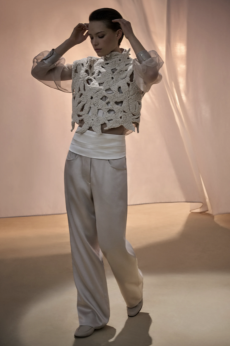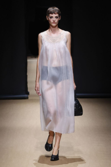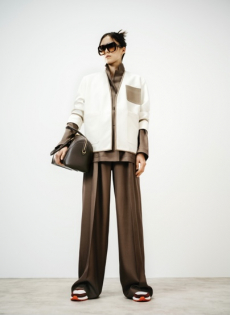 The silhouette is made for women in motion: precise yet breathable, revealing yet composed. Bras and gilets become styling anchors, worn beneath or above transparent layers in controlled contrasts of skin and shadow. Knitwear sculpts and releases, dancing with light like wearable architecture.Accessories speak softly but with intent. Kitten heel mules offer freedom and poise, while a new soft bag, complete with Sportmax’s S-hardware and leather flora, finishes the look with elegance in motion.