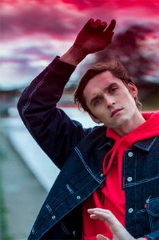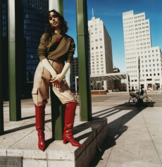 Shot by German photographer Dylan Don outdoors in the ground-breaking Muralla Roja compound is Calpe, Spain, designed by Spanish architect Ricardo Bofil, Goode displays a unique and controlled attitude against the sun-soaked hues of the buildings.