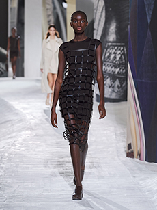 Akris’s SS26 reads like a quiet manifesto in form and colour — less a collection than a spatial poem. Here, geometry is not solely structural; it becomes a language: trapezoids stitch the silhouette into punctuation, fragmented belts carve the waist like glyphs, and in?house drape?fringe knit sculpts skin into soft architecture. Colour arrives as a horizon — lapis, vermillion and orange cutting across ecru and black — flashes that puncture the reductive calm and insist on presence.