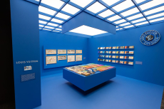 This whimsical journey began in 2019 with Catogram, a playful dialogue between Coddington’s cats Pumpkin and Blanket and Nicolas Ghesquière’s dogs, Achille and Léon. Today, her current muses — Blondie, Blanket, and Jimi — venture even further, roaming from Sydney to London, the Amazon to the Great Wall of China, and even into space. Their travels inspire a series of graphic patches reminiscent of labels once adorning Louis Vuitton trunks, charting destinations near and far.