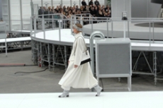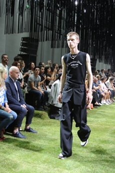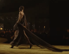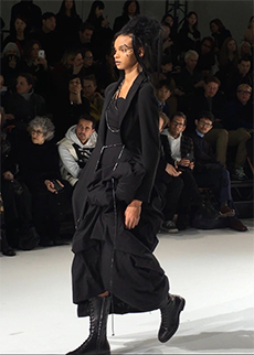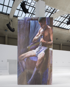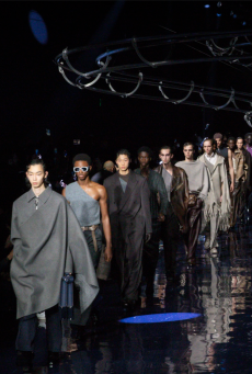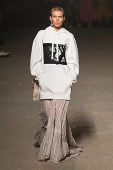 Rick Owens for Fall Winter 2017 designed a collection channelling the need for a positive new beginning rooted in the idea of collectivity, of gathering together, of human kind in its social form. It had a sense of austerity, of deep hope for a better future. As the model walked in the dry space of Palais de Tokyo, one following the other and randomly walking around the space it felt as a vortex of shapes, volumes and lengths was wrapping up the audience.